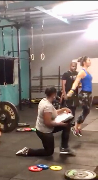 Je me place devant ma barre de squat clean. Je me suis entraînée à 35 kg seulement. Oui généralement on charge plus à l’échauffement pour que cela paraisse plus simple ensuite mais comme mon max est à 45 kg je ne me sentais pas trop de charger plus que la barre de 38kg du wod pour l’échauffement au risque de me cramer …