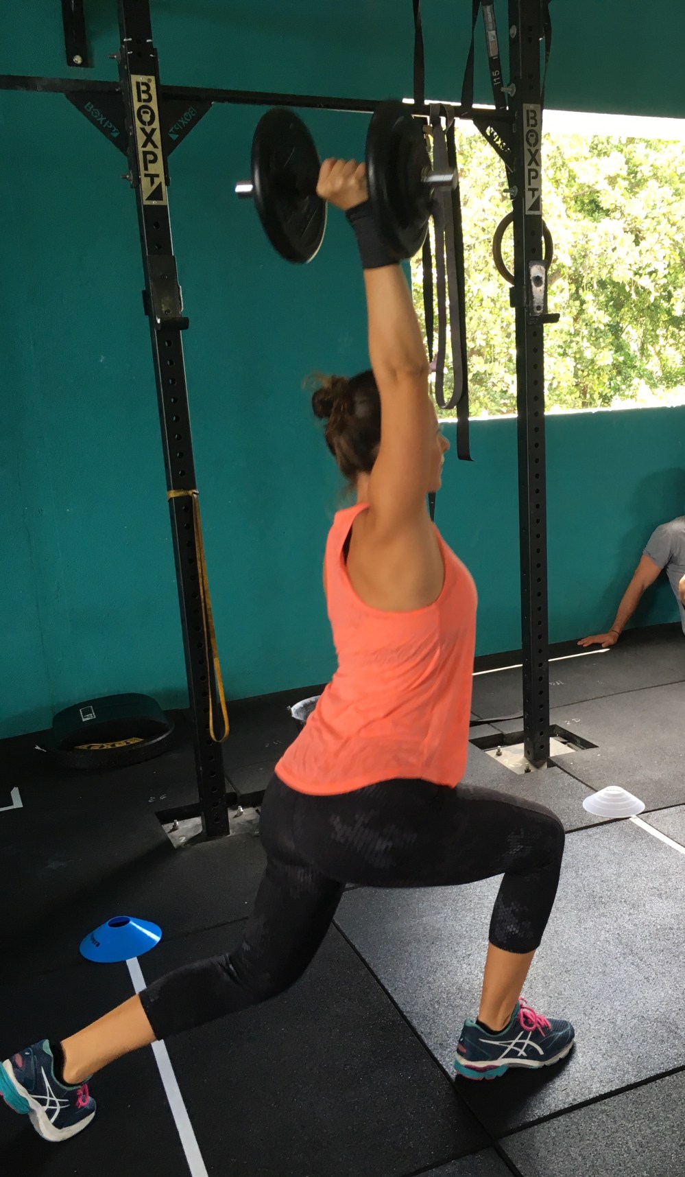 Mon bras gauche est plus faible ? pas grave, je ferai au total 1,5 aller retour uniquement avec le bras gauche et le reste avec le bras droit. J’ai évidemment perdu pas mal de temps par rapport à la version scaled de la veille sur les lunges mais arrivée sur ma box, je calle ma dumbbell sur l’épaule droite et hop, j’enchaîne 25 rép unbroken. Doucement mais régulièrement, sans pause, sans hésitation ! en fait, j’ai tellement lutté sur les lunges que la 2nde partie me semble plus simple. Pour la 26ème rép, je pose la dumbbell sur la caisse, juste le temps de changer de côté et me voici repartie pour 25 rép unbroken.