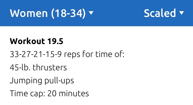 Bref, pour ce 19.5, voici la donne qui clairement s’annonce hors de portée pour moi en RX ! 105 rep de trusters à 29kg et 105 chest to bar … alors que je n’en passe toujours pas (et que j’en suis carrément loin!)… le 19.5 en Scaled ça donne ça: