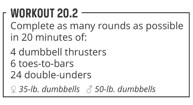 Le résumé de ce 20.2, il est simple, et rapide : le chrono sonne le départ des 20 mn et j’attrape mes 2 dumbbells. Je les clean puis, après avoir repris mon souffle, je pars sur mon 1er Thruster. Pas de pression, la charge est lourde, je ne me précipite pas, je verrouille bien mes coudes une fois en extension et je me repositionne avec les dumbbells sur les épaules avant de repartir pour une deuxième rép. L’une après l’autre, sans pression, même si tout le monde est déjà parti sur sa barre quand j’entame ma 4ème rép.