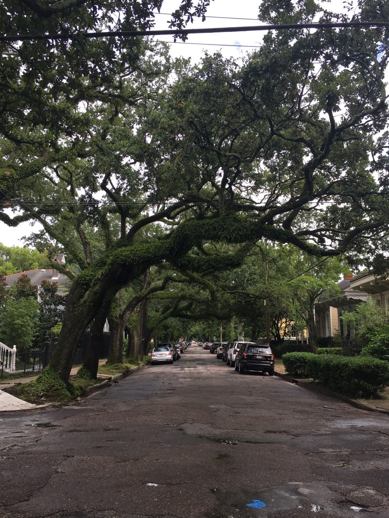 On commande donc un Uber pour aller Bruncher chez « Another broken eggs ». Le soleil revient progressivement et on enchaîne donc par un petit tour à pieds dans le quartier qui nous amène tout droit sur Garden District et ses magnifiques maisons. Mais également de jolies petites rues ou de grosses avenues avec des Chênes centenaires de partout ! Ils sont partout !! et tellement majestueux ! On marche la tête en l’air en admiration devant la nature mais aussi devant les jolies façades des maisons. On distingue aussi souvent dans les arbres des colliers de perles en plastique de toutes les couleurs. Les restes de Mardi Gras … même fin juillet !